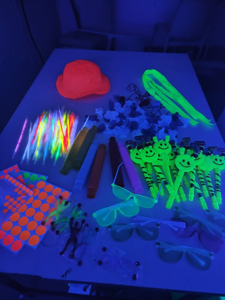 בעמדה מחכים לילדים אביזרי ג'אגלינג מגוונים לרבות כדורים רכים, חישוקים, צעיפים, מקלות איזון ואביזרים נוספים בדרגות קושי שונות.